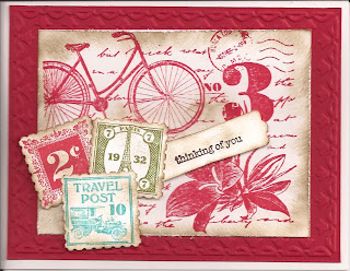 My sister, Angie Martino, teaches a stamping class a couple times a month in her home. Here are the cards I made in her class today that she designed. I think I like the red vintage card best.